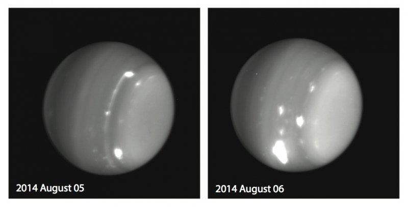 Obserwacje Urana na paśmie podczerwieni z 5 i 6 sierpnia 2014 / Credits - Keck, Imke de Pater (UC Berkeley), Larry Sromovosky and Pat Fry (U. Wisconsin), and Heidi Hammel (AURA)Na początku sierpnia tego roku astronomowie zaobserwowali masywne huragany na Uranie.