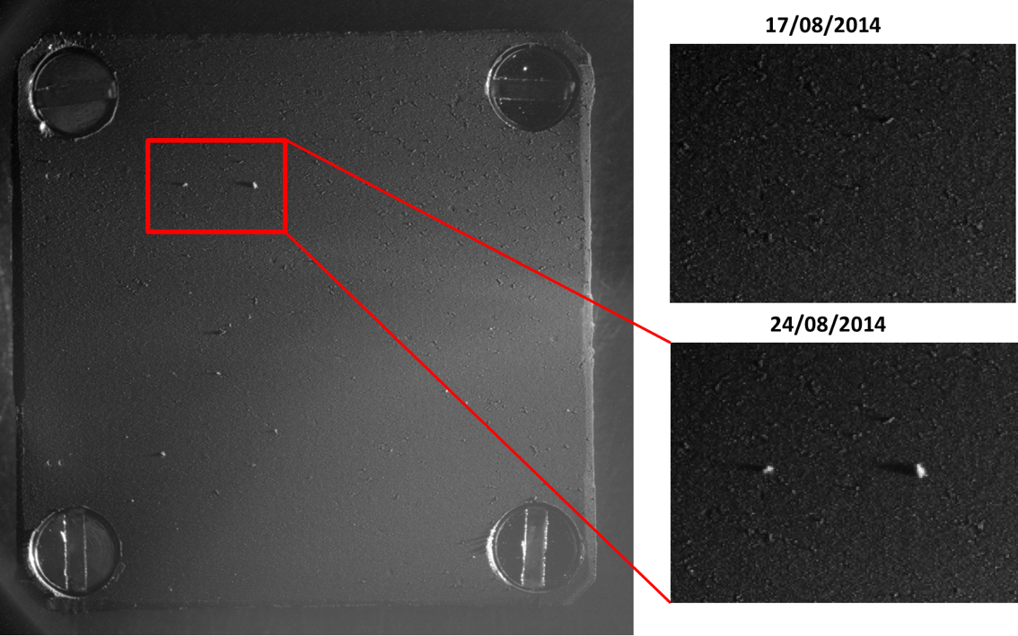 Jedna z płytek, 1 cm x 1 cm, przechwytujących instrumentu COSIMA. Po prawej zbliżenie płytki przed i po przechwyceniu ziaren. Płytka jest oświetlona diodami LED z prawej strony. Cień ziaren jest proporcjonalny do ich wysokości. Rozdzielczość zdjęcia wynosi 14 mikrometrów na piksel. / Credits: ESA/Rosetta/MPS for COSIMA Team MPS/CSNSM/UNIBW/TUORLA/IWF/IAS/ESA/BUW/MPE/LPC2E/LCM/FMI/UTU/LISA/UOFC/vH&SPod koniec następnego tygodnia, 13 i 14 września, w Tuluzie, podjęta ma zostać decyzja o wyborze podstawowego i zapasowego miejsca lądowania Philae. Proces wyboru przedstawiliśmy w obszernym artykule.