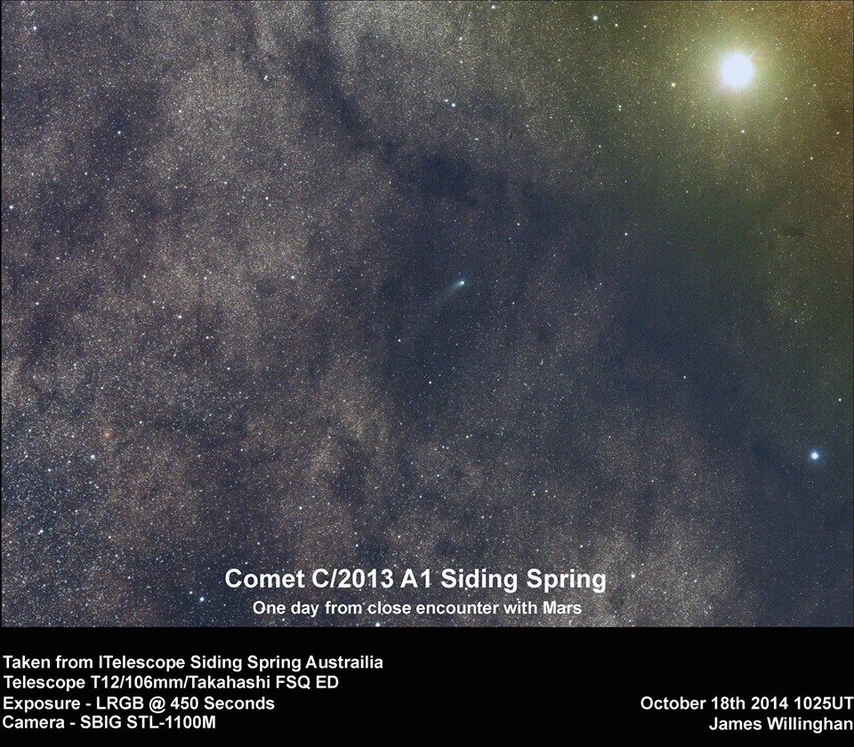 Roberta McNaughta z Siding Spring Observatory za pomocą 50-centymetrowego teleskopu Uppsala Southern Schmidt Telescope. Kometa minie Marsa z prędkością względną około 56 km/s 19 października 2014 roku.