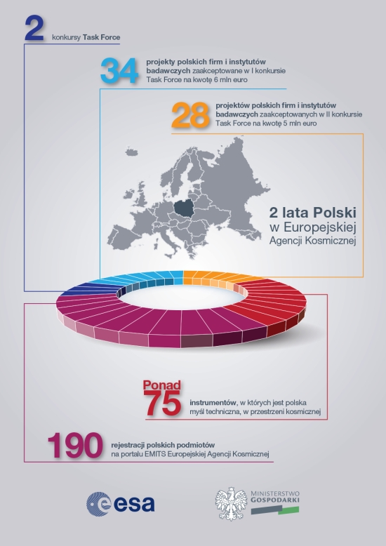 Infografika Ministerstwa Gospodarki, zawierająca wybrane informacje o udziale Polski w projektach ESA / Credits – MGDziewiętnastego listopada minęła druga rocznica wejścia Polski do Europejskiej Agencji Kosmicznej.