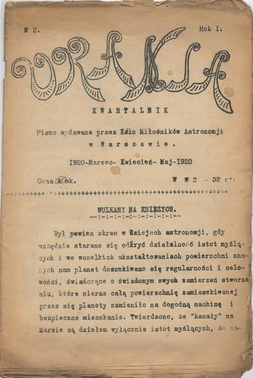 Czytelnicy najnowszego numeru Uranii Postępów Astronomii mają okazję poznać historię pierwszego numeru czasopisma astronomicznego dla miłośników astronomii jaki pojawił się w naszym kraju w roku 1920. To już niedługo 100 lat jak niewielka grupa miłośników kosmosu z warszawskich gimnazjów (1919r.), powołała do życia międzyszkolne Koło Miłośników Astronomii. Podjęli oni decyzję o rozpoczęciu wydawania kwartalnika popularyzującego wiedze o Wszechświecie.
