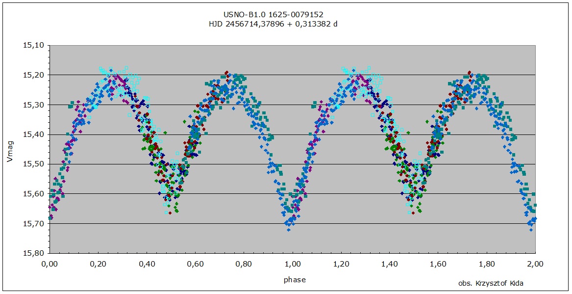 Krzywa zmian jasności USNO-B1.0 1625-0079152 / Credits - Krzysztof KidaAstronomowie amatorzy Krzysztof Kida i Maciej Mącidym odkryli nową gwiazdę zmienną, oznaczoną jako USNO-B1.0 1625-0079152.