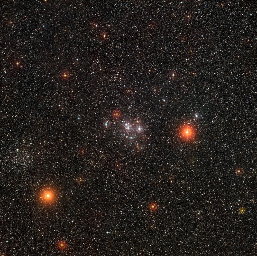 Jasny biało-niebieski kolor gwiazd jest wskazówką ich temperatury, gorętsze gwiazdy wydają się bardziej niebieskie, a chłodniejsze bardziej czerwone. Związek pomiędzy kolorem, jasnością i temperaturą można wizualizować za pomocą krzywej Plancka. Ale bardziej szczegółowe badania kolorów gwiazd za pomocą spektroskopii ujawniły astronomom dużo więcej – w tym tempo obracania się gwiazd i ich skład chemiczny. Na zdjęciu znajduje się także kilka czerwonych gwiazd – są to czerwone olbrzymy, których krótkie życie jest na bardziej zaawansowanym etapie niż mniej masywnych i dłużej żyjących gwiazd niebieskich [1].