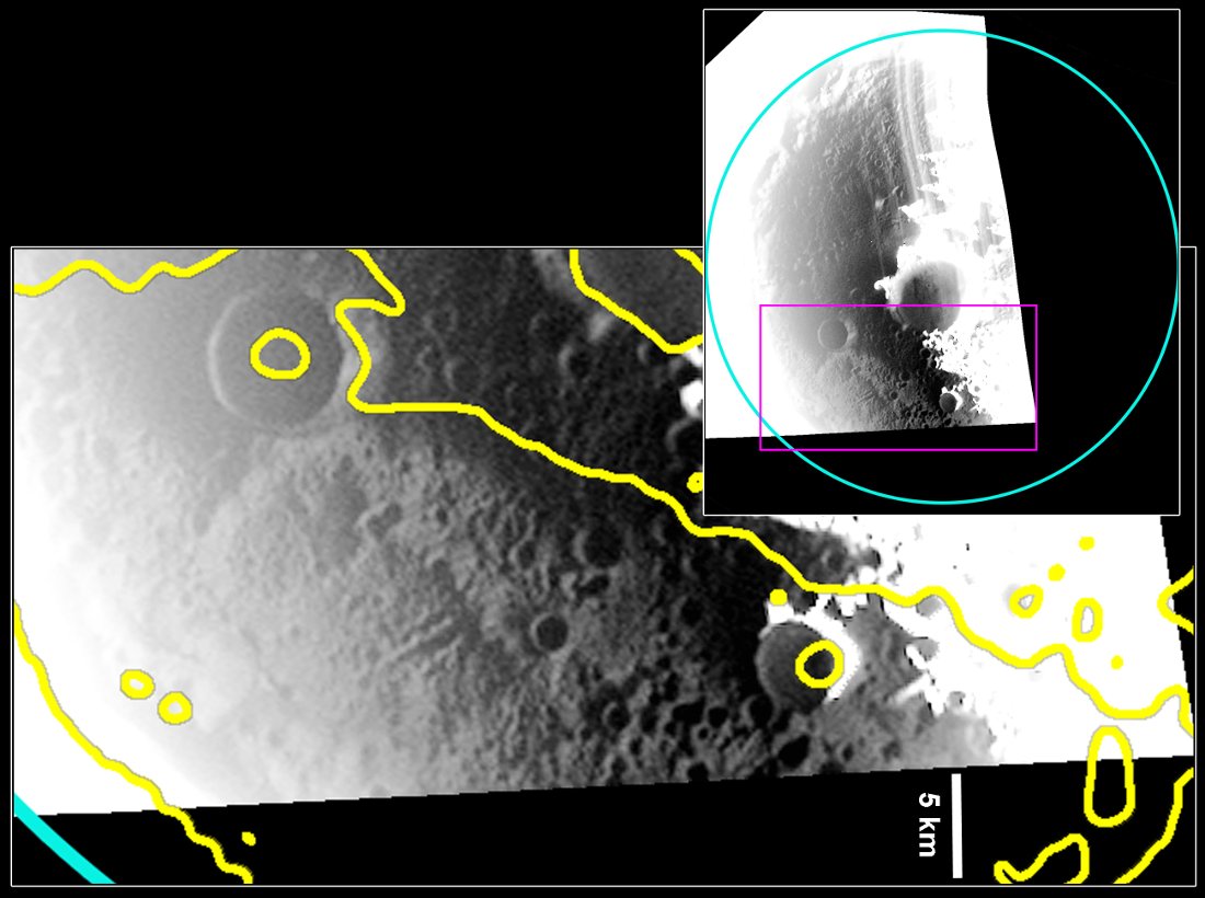Wnętrze krateru Prokofjew. Jasny obszar optycznie odpowiada także jasnemu obszarowi w obserwacjach radarowych (obszar zaznaczony żółtą linią), co sugeruje obecność lodu na powierzchni wnętrza krateru / Credits – NASA/Johns Hopkins University Applied Physics Laboratory/Carnegie Institution of WashingtonWnętrze krateru Prokofjew, w którym wykryto wyeksponowany lód, wyróżnia się od wnętrza krateru Berlioz, w którym znajduje się ciemna warstwa związków organicznych. W obszarze, w którym występuje lód wodny we wnętrzu krateru Prokofjew znajduje się dużo małych kraterów. Z kolei w ciemnym obszarze krateru Berlioz takich kraterów nie zauważono. Te obrazy zdają się sugerować, że woda została dostarczona na Merkurego stosunkowo niedawno (w geologicznej skali) lub jest stale dostarczana. Odpowiedź na zagadkę źródła lodu wodnego na tej planecie wydaje się jeszcze być odległa i możliwe, że dopiero kolejna misja przyniesie więcej danych.
