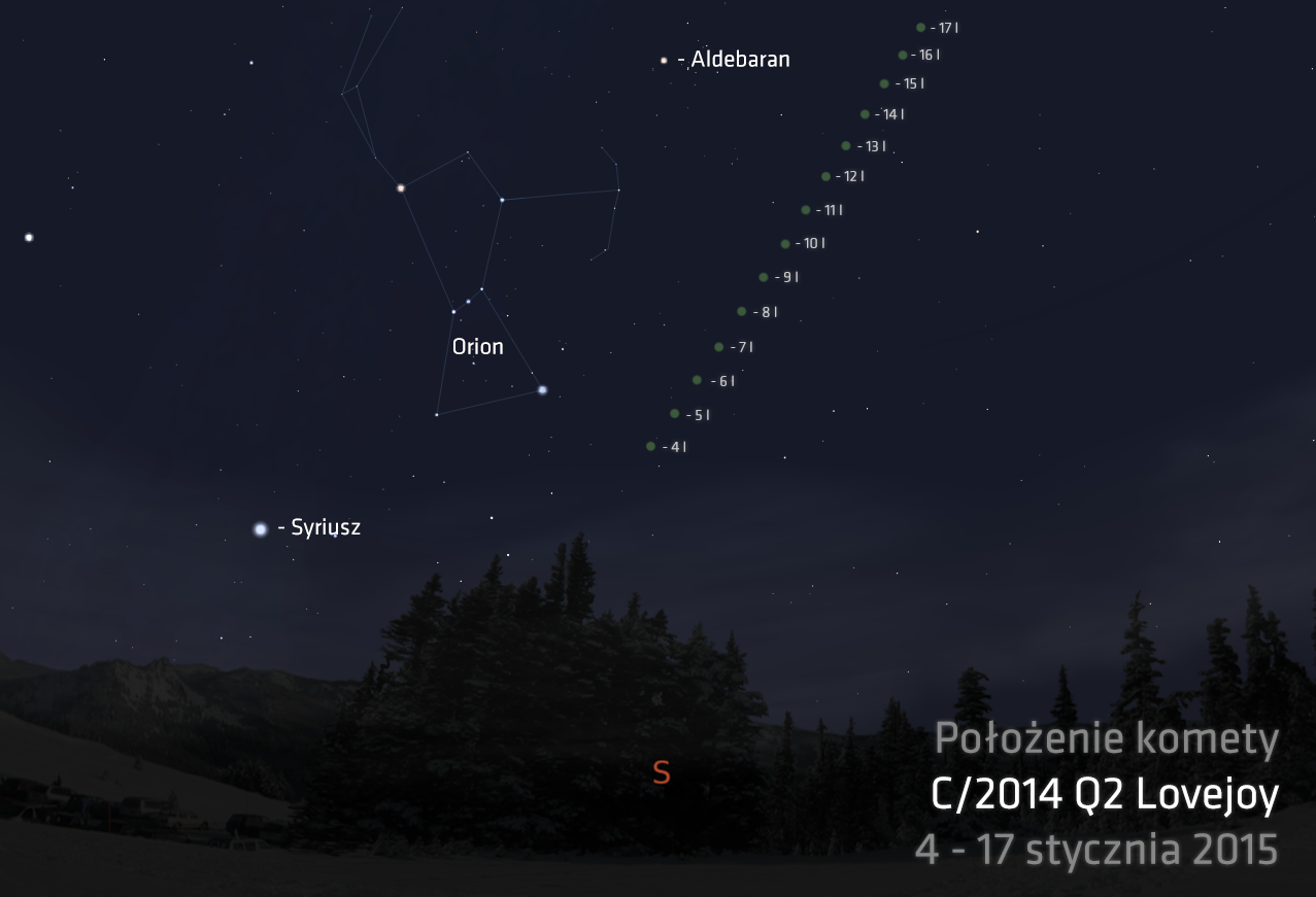 Na niebie jest widoczna piękna kometa o nazwie C/2014 Q2 Lovejoy. Widoczna już była wcześniej, na jesień 2014 roku, ale z racji naszego położenia na globie Ziemi, u nas widoczna jest dopiero teraz i w nagrodę pięknie błyszczy na zielono oraz rozciąga swój ogon przez sporą część nieba. Obecnie jest widoczna na wysokości Rigela z Oriona. Ale będzie dość szybko wędrować do góry naszego nieba. Mapki pomogą ją odszukać a my zachęcamy do obserwacji. Poza miastem zobaczysz ją nawet okiem nieuzbrojonym. A z lornetka czy niewielkim teleskopem można przyjrzeć jej z większym skupieniem.