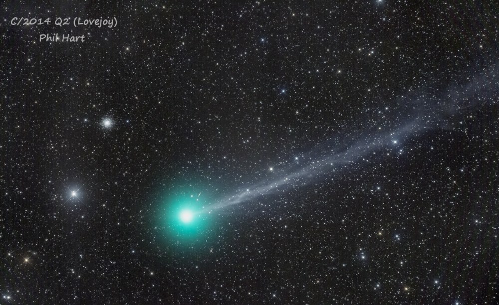 C/2014 Q2 sfotografowana przez Phila HartaJeszcze nie ostygły fajerwerki po sylwestrowych szaleństwach a my już ostro bierzemy się do pracy. No z tym ostro to trochę przesady, bo w to co robimy ma być również przyjemne, ale fakt jest faktem, że rozpoczęliśmy kładzenie ekrany na sferę naszego planetarium. A to prawie 20 m2 do położenia a potem ….. jeszcze masa innej roboty. Jako, że pogoda jest taka jaka jest, każdy widzi, zajęliśmy się mikrokosmosem. To ciąg dalszy ścieżek matematycznych w naszych kręgach. Tak matematycznych, gdyż ten kosmos jest trudny do zobaczenia, a raczej jest tylko do liczenia. A jako, że materializuje się nasze wydania astrokalendarza na 2015 rok, z opóźnieniem, to o roli kalendarzy w naszej niedługiej historii trzeba było wspomnieć. Więc wspomnieliśmy i to nie tylko.