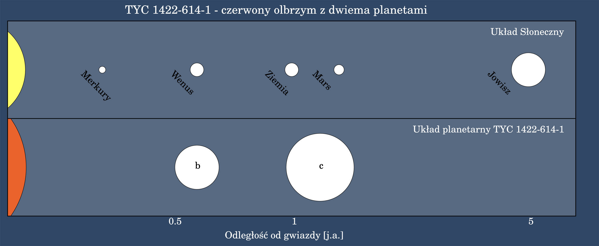Rysunek 1. Porównanie wewnętrznej części Układu Słonecznego z układem planetarnym TYC 1422-614 1. Planety "b" i "c" oddalone są od swojej gwiazdy o 0,69 i 1,37 j.a., czyli podobnie jak Mars i Wenus w Układzie Słonecznym. Są jednak znacznie bardziej masywne: planeta "b" ma masę 2,5 masy naszego Jowisza, a planeta "c" aż 10 razy większą niż Jowisz (skala nie została zachowana).