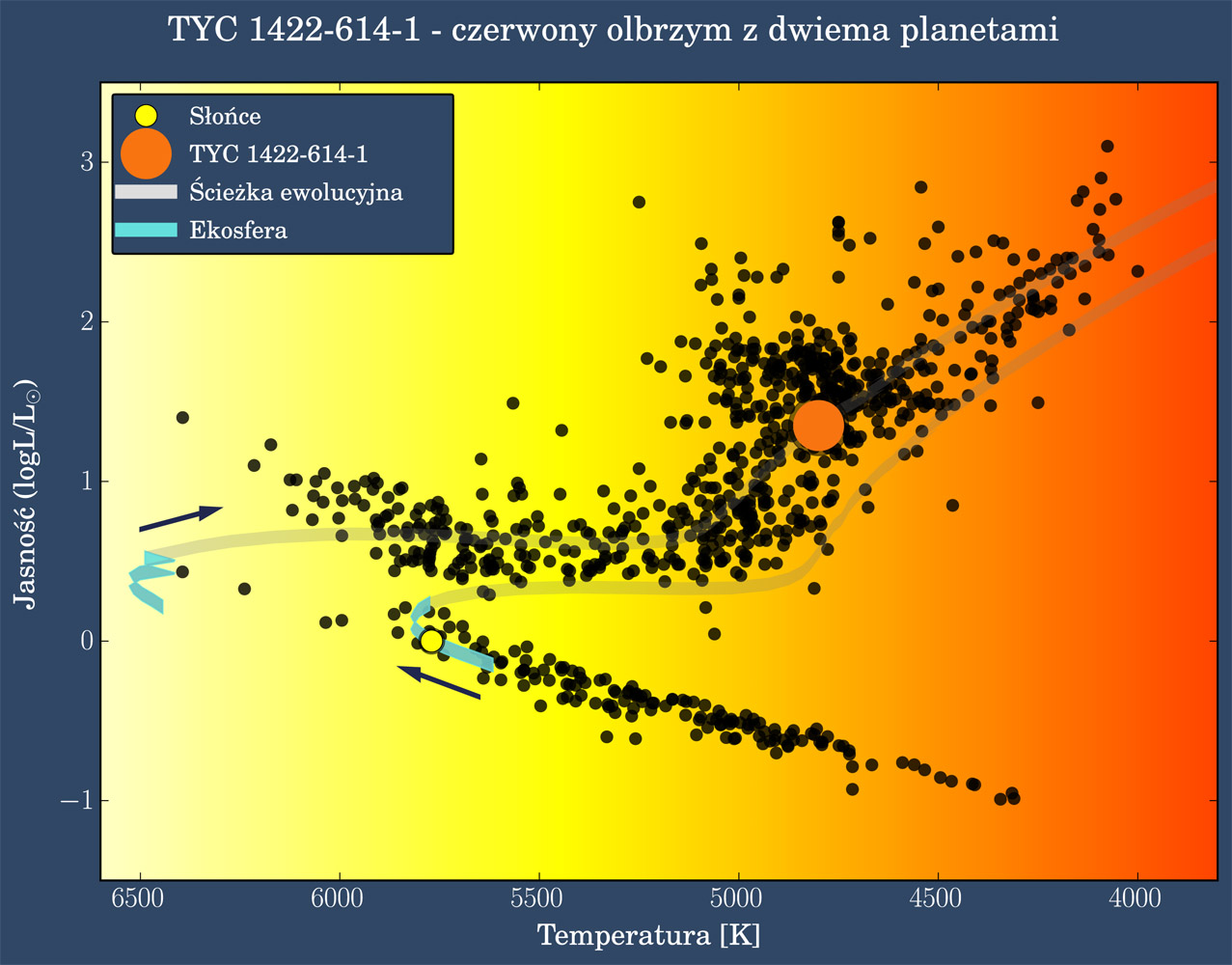 Rysunek 2. Porównanie stopnia ewolucyjnego zaawansowania Układu Słonecznego oraz układu planetarnego TYC 1422-614 b, c na diagramie Hertzsprunga-Russela. Na osi poziomej odłożono temperaturę efektywną (kolor) gwiazdy, a na osi pionowej jej jasność (w skali logarytmicznej, w stosunku do Słońca). Czarne punkty to gwiazdy badane w ramach projektu Pensylwańsko-Toruńskiego. Słońce znajduje się na etapie spokojnego jądrowego palenia wodoru w centrum, czyli na ciągu głównym, gdzie gwiazdy spędzają większość swego życia. Przebieg przyszłej ewolucji Słońca zaznaczono szarą linią, strzałka wskazuje kierunek przebiegu ewolucji. Na niebiesko oznaczono tę część ewolucji Słońca, podczas której Ziemia znajduje się w ekosferze. TYC 1422-614-1 jest gwiazdą znacznie bardziej wyewoluowaną niż Słońce co ilustruje pozycja na jej ścieżce ewolucyjnej (kształt ścieżki ewolucyjnej zależy od masy gwiazdy oraz składu chemicznego, stąd TYC 1422-614-1 ma inną nieco przyszłość niż Słońce). Wyczerpała ona zwoje zapasy wodoru w centrum i jej centralne części zapadają się tworząc powoli warunki do rozpalenia reakcji jądrowych palenia helu. Jest ona czerwonym olbrzymem, chłodniejszą i znacznie większą od Słońca gwiazdą. Etap jej ewolucji, podczas którego planeta "c" znajdowała się w ekosferze także zaznaczono na niebiesko. Zakończył się on kilkaset milionów lat temu. Źródło: Uniwersytet Mikołaja Kopernika w ToruniuBrązowe karły to kategoria obiektów pośrednich pomiędzy planetami a gwiazdami. Czasem używa się określenia, że to „nieudane gwiazdy”. Mają masy większe niż planety, ale zbyt małe, aby zainicjować reakcje termojądrowe syntezy wodoru w hel i w ten sposób stać się gwiazdą. Obiekty te są natomiast zdolne do syntezy deuteru, co odróżnia je od planet.