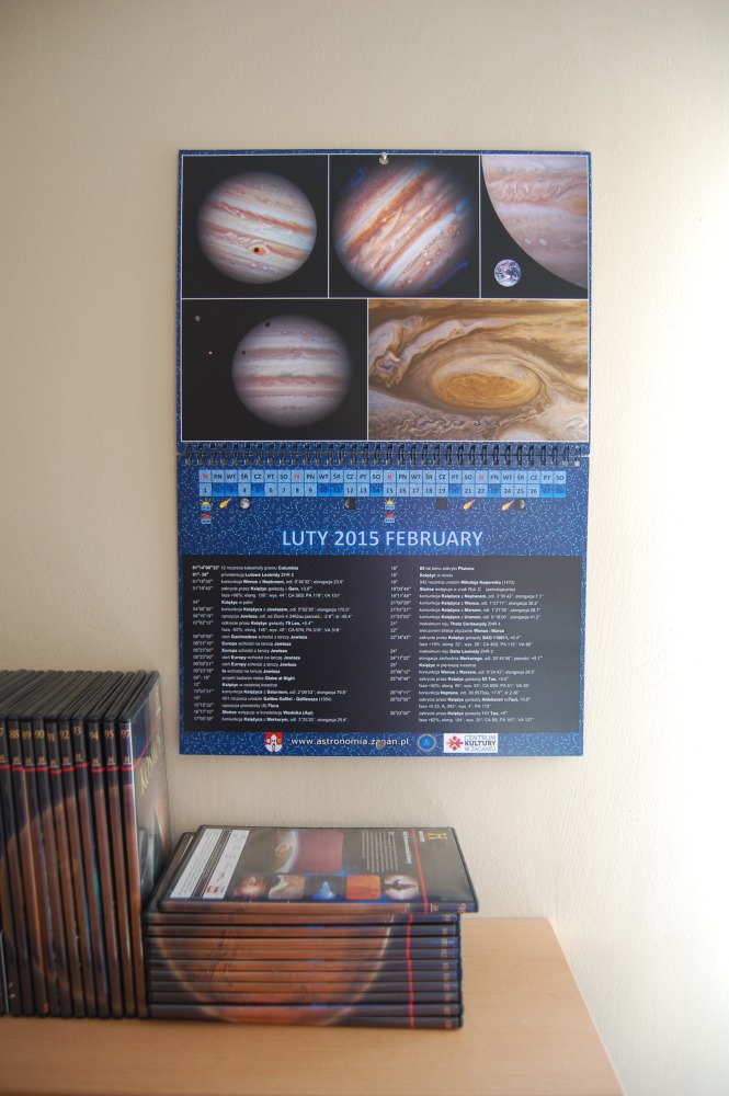 Astrokalendarz 2015 w typowym dla siebie miejscuKalendarz zawiera tym razem 26 stron. Połączony spiralą w środkowej części po rozwieszeniu tworzy format A3. Więc całość prezentuje się niezwykle atrakcyjnie graficznie. Cel jest jednak znacznie bardziej astronomiczny. W dolnej części znajduje się kalendarium zjawisk astronomicznych. Jest ono opracowane na podstawie wielu różnych źródeł. Zawiera dzięki temu efemerydy licznych zjawisk astronomicznych możliwych do zaobserwowania przez miłośnika astronomii. Są to na tyle proste obserwacje, że można je wykonać prostym sprzętem astronomicznym, a często można się obejść i bez niego. Są tam czasy wschodów i zachodów słońca, fazy Księżyca, dni i czas zjawisk w układzie Jowisza, widoczność planet i planetoid, maksima rojów meteorowych czy rocznice wydarzeń historycznych mający związek z odkryciami astronomicznymi czy tez zdobywaniem kosmosu. Dla koneserów znajdują się wybrane zjawiska zakryciowe.