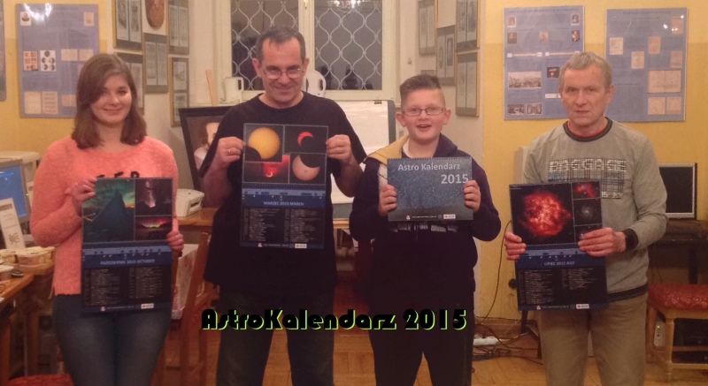 Tegoroczne wydanie astrokalendarzaOstatnie dwa tygodnie upłynęły Sekcji w atmosferze wytężonej pracy. W pierwszej kolejności ruszyło dostarczenie do odbiorców naszego kalendarza astronomicznego na 2015r. w tym roku wydanie w ilości bibliofilskiej – 50 egz. Pozwala to zaopatrzyć najbardziej zainteresowanych tym wydaniem. Ale na rynku pojawiło się co najmniej kilka projektów tego typu więc zawsze jakiś trafi do rąk miłośników nieba. Tuż za kalendarzem wre praca nad planetarium. Chcemy zdążyć z zakończeniem projektu na Noc Planetariów w marcu br. Brak dobrej pogody do obserwacji sprzyja pracom, ale odkłada najlepsze warunki do obserwacji na mniej korzystny czas. Przyszły tydzień ma szansę mieć trochę pogodnych nocy.
