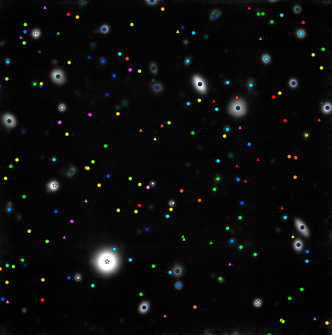 W każdym fragmencie widoku MUSE na głębokie pole HDF-S mamy nie tylko piksel ze zdjęcia, ale także widmo ujawniające natężenie światła w różnych kolorach składowych w tym punkcie – razem około 90 000 widm [1]. Pozwala to na ustalenie odległości, składu chemicznego i wewnętrznych ruchów setek odległych galaktyk, a także wyłowienie niewielkiej liczby bardzo słabych gwiazd Drogi Mlecznej.