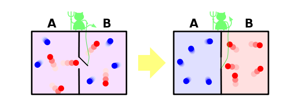 Schematic figure of Maxwell's demonBadacze postanowili przyjrzeć się temu, jak druga zasada termodynamiki działa w świecie mikroskopowym. Prawo to zakłada, że w zamkniętym układzie entropia (wyraża ona stopień nieuporządkowania układu) musi wzrastać. A więc nie może być tak, że układ - jeśli nie dostarczy się do niego energii z zewnątrz - całkiem się uporządkuje. Z zasady tej wynika też m.in. to, że ciepło nie może samo z siebie przepływać z ciała zimniejszego do cieplejszego - może być tylko odwrotnie. A to z kolei prowadzi do pewnych fizycznych ograniczeń np. w konstrukcji silników.