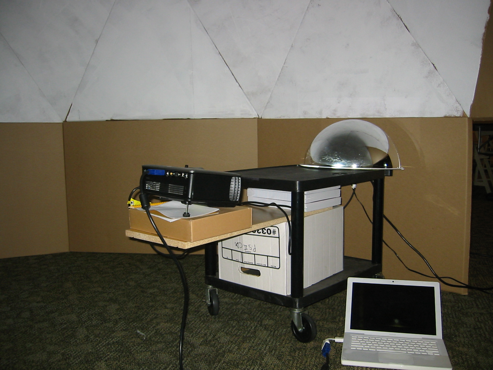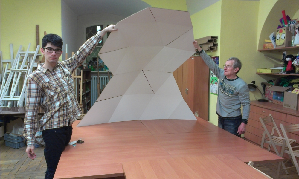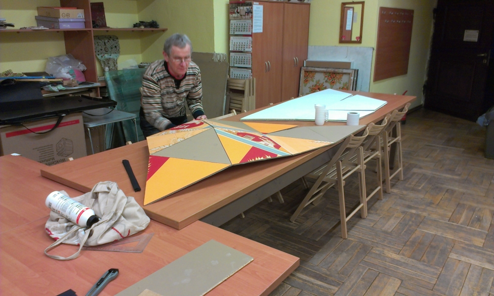 Prace przy łączeniu kartonowych trójkątów w segmentyZ pomocą przyszła wiedza. Od dziesięcioleci stosuje się wybrane rozwiązanie w różnych budowlach architektonicznych opartych na idei Fullera. Pierwszą kopułę tego typu wybudowano w 1923 według projektu niemieckiego inżyniera Walthera Bauersfelda z przeznaczeniem na planetarium w Jenie. Pod koniec lat 40. XX wieku idee te zostały rozwinięte i spopularyzowane przez amerykańskiego konstruktora, architekta, kartografa i filozofa Richarda Fullera, który jest również twórcą nazwy „kopuła geodezyjna". Korzystając z odpowiednich narzędzi miłośnicy astronomii przygotowali swój projekt kopuły o średnicy 3m. Po różnych próbach wybrano najlepszy ich zdaniem sposób i materiał z którego zostanie ona wykonana. Warunkiem koniecznym była możliwość rozmontowania konstrukcji oraz jej przeniesienia w inne miejsce oraz eksploatacja jej w pomieszczeniach zamkniętych. Jako pierwszą lokalizację wybrali oni swoją salę pracy, która posiada odpowiednie wymiary minimalne na ten cel.