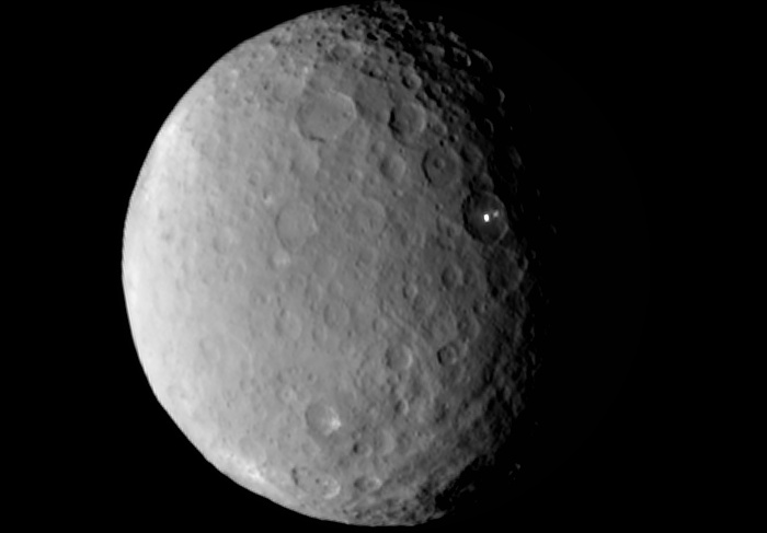 Naukowców jednak najbardziej intryguje bardzo jasne i wyróżniające się wnętrze jednego z kraterów Ceres o średniej wielkości. Jest to bardzo wyróżniający się szczegół powierzchni tej planety karłowatej, o którym jak na razie niewiele wiadomo. Wielu naukowców obecnie uważa, że jest to odsłonięty lód wodny.