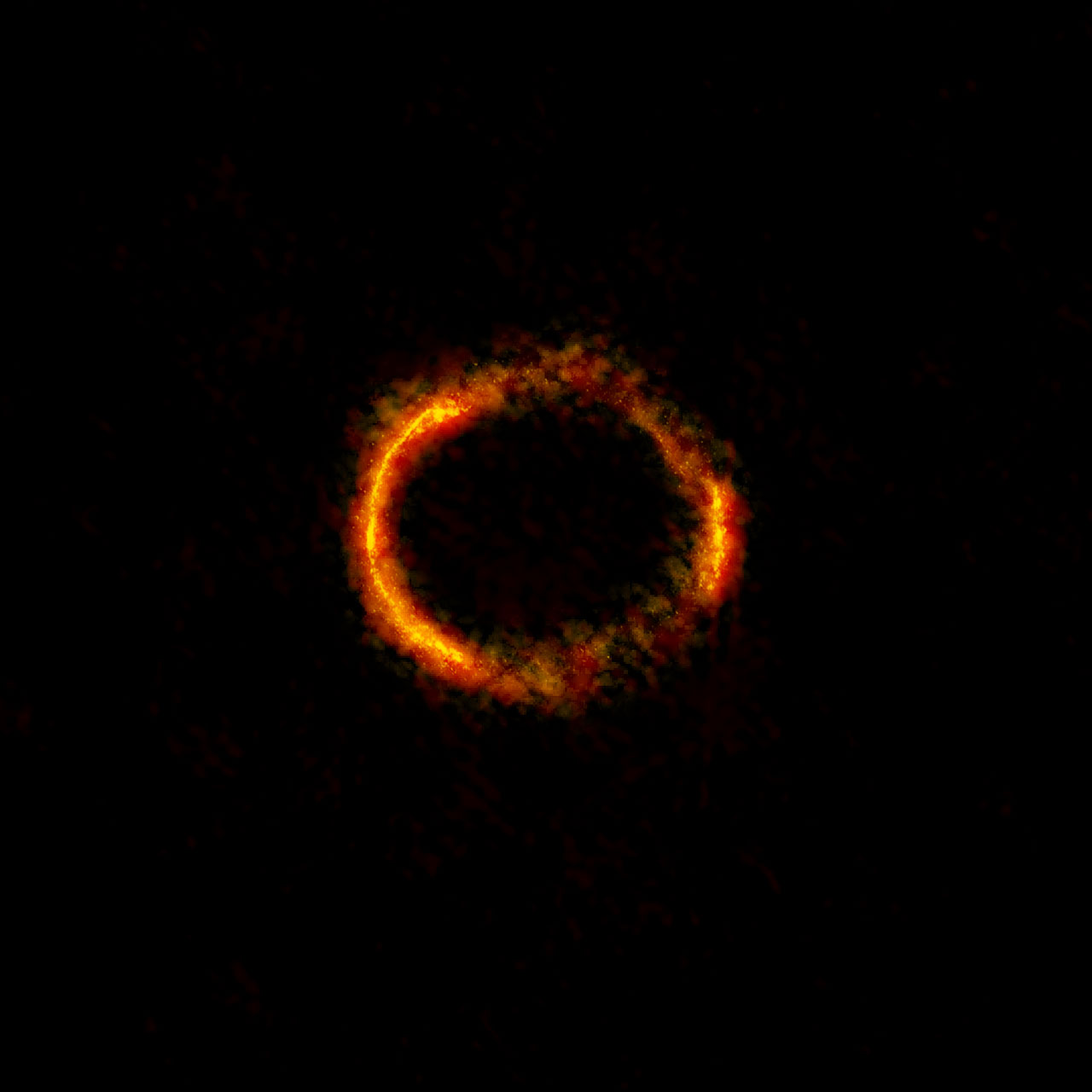 The bright orange central region of the ring (ALMA's highest-resolution observation ever) reveals the glowing dust in this distant galaxy. The surrounding lower-resolution portions of the ring trace the millimetre-wavelength light emitted by carbon dioxide and water molecules.