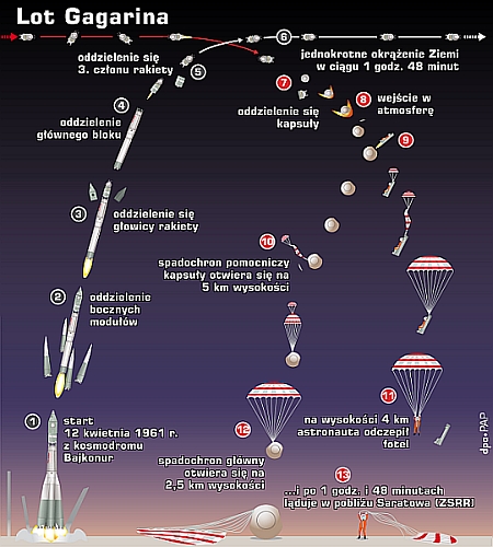 OpisZdjecia12 kwietnia 1961 roku nastąpiło historyczne wydarzenie, Jurij Gagarin dokonał pierwszego w historii lotu w kosmos. Kierował statkiem kosmicznym Wostok 1, którym okrążył Ziemię jeden raz. Start nastąpił z kosmodromu Bajkonur godzinie 6:07 czasu uniwersalnego, a o 7:55 nastąpiło lądowanie. Lot trwał 108 minut. W 1960 roku w b. Związku Radzieckim rozpoczęto szkolenie pierwszej grupy przyszłych kosmonautów. Należało do niej sześć osób wyłonionych spośród 20 pilotów wojskowych, wyselekcjonowanych wcześniej spośród 2200 kandydatów. Na koniec szkolenia dwoma kandydatami do pierwszego lotu zostali Jurij Gagarin oraz Herman Titow. Rywalizację ostatecznie wygrał Gagarin i to on został pierwszym człowiekiem w kosmosie. Titowowi przypadła rola drugiego radzieckiego kosmonauty, w kolejnym locie w sierpniu 1961 roku.