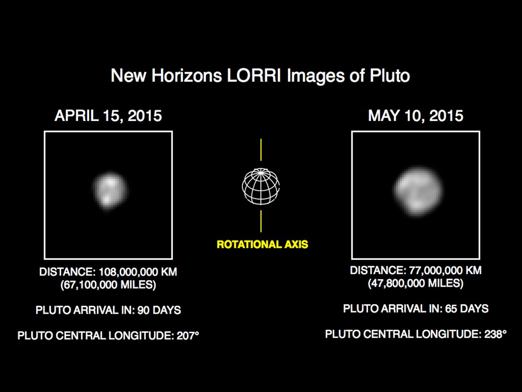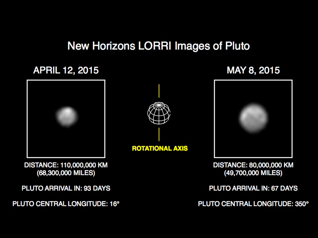 Porównanie obrazów Plutona z 15 kwietnia i 10 maja / Credits – NASAW połowie kwietnia sonda NH wykonała serię zdjęć Plutona i Charona z odległości około 111-103 milionów kilometrów. Wówczas Pluton był mniejszy niż dziesięć pikseli. Wystarczyło to do wysnucia tezy, że Pluton może posiadać czapy polarne.