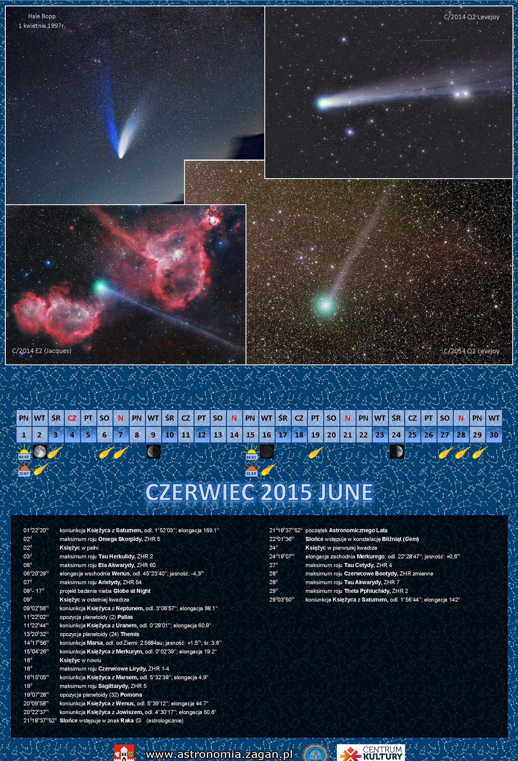 Jeśli chodzi o planety, to Merkurego znajdziemy dopiero po pierwszej dekadzie miesiąca, bardzo nisko na porannym niebie, tuż przed wschodem Słońca. Najdogodniejsze warunki do jego dostrzeżenia i obserwacji będą po 23.VI. Natomiast Wenus jako Gwiazda Wieczorna, bryluje wysoko na zachodnim niebie przez cały czerwiec, aż do początku sierpnia, a wieczorem 1 lipca będzie romansowała z Jowiszem. W czerwcu nie zobaczymy Marsa, bowiem kryje się on w promieniach Słońca przez cały miesiąc. Jowisza, dostrzeżemy od wieczora wysoko na zachodnim niebie, początkowo w gwiazdozbiorze Raka, a od drugiego tygodnia w Lwie. Z upływem dni czerwcowych będzie on coraz to niżej nad horyzontem, by wieczorem 1 lipca zbliżyć się do Wenus na odległość 0.4 stopnia. Saturna w gwiazdozbiorze Wagi, możemy obserwować przez całą noc. Wieczorem, 1.VI. o godz. 22, do planety zbliży się na odległość jednego stopnia Księżyc, podążający do pełni. Uran gości w gwiazdozbiorze Ryb, widoczny jest na wschodnim niebie, aż do świtu. Neptuna w Wodniku, można obserwować nisko na wschodnim niebie, w drugiej połowie nocy. Aby dostrzec te dwie ostatnie planety gołym okiem, trzeba mieć jednak sokoli wzrok.