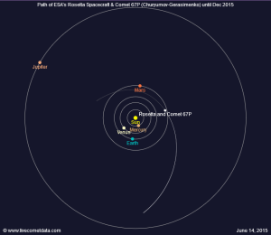 W sobotnie popołudnie Europejska Agencja Kosmiczna oficjalnie poinformowała, że dzień wcześniej, 13 czerwca o 22:28:11 CEST nawiązała jednokierunkową łączność z lądownikiem Philae, znajdującym się na komecie 67P/Czuriumow-Gierasimienko. Lądownik przez 211 dni (od 15 listopada 2014) pozostawał w stanie hibernacji i jego wybudzenie się nie było do końca pewne. Położenie komety 67P w dniu 14 czerwca 2015 / Credit: livecometdata.comSygnał został nadany poprzez sondę Rosetta i odebrany 70-metrową anteną w Goldstone, należącą do NASA. ESA odebrała w ten sposób ponad 300 pakietów danych z lądownika. Połączenie trwało 85 sekund. Są one teraz analizowane przez centrum kontroli lądownika w Niemieckiej Agencji Kosmicznej DLR. W pamięci lądownika “zalega” jeszcze około 8000 pakietów danych, które oczekują na przesłanie.