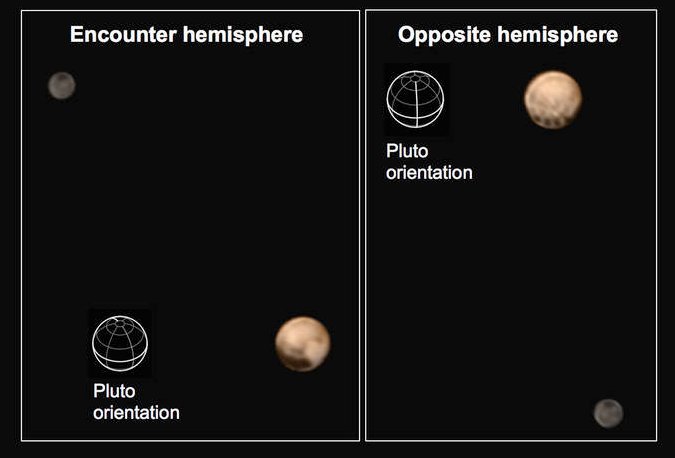 Dwie strony Plutona, charakteryzujące się innymi jasnymi i ciemnymi obszarami / Credits - NASA/Johns Hopkins Applied Physics Laboratory/Southwest Research InstituteNajnowsze obserwacje sugerują, że nie ma ryzyka zderzenia New Horizons z pierścieniami Plutona.