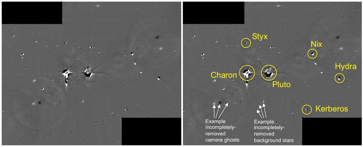 Poszukiwanie nieznanych księżyców i pierścieni Plutona (bez rezultatu) / Credits – NASA/JHU-APL/SwRIFaza przelotu obok Plutona trwać będzie pomiędzy 13 a 15 lipca. Wówczas NH będzie przebywać w odległości mniejszej od 1,2 mln kilometrów od celu swojej misji. To właśnie wtedy znaczna większość obserwacji i pomiarów zostanie wykonana. Moment największego zbliżenia do Plutona nastąpi 14 lipca około godziny 13:50 CEST. Wówczas NH znajdzie się 13500 km od Plutona, 29500 km od księżyca Charona, 22000 km od księżyca Nix i 77600 km od księżyca Hydra.
