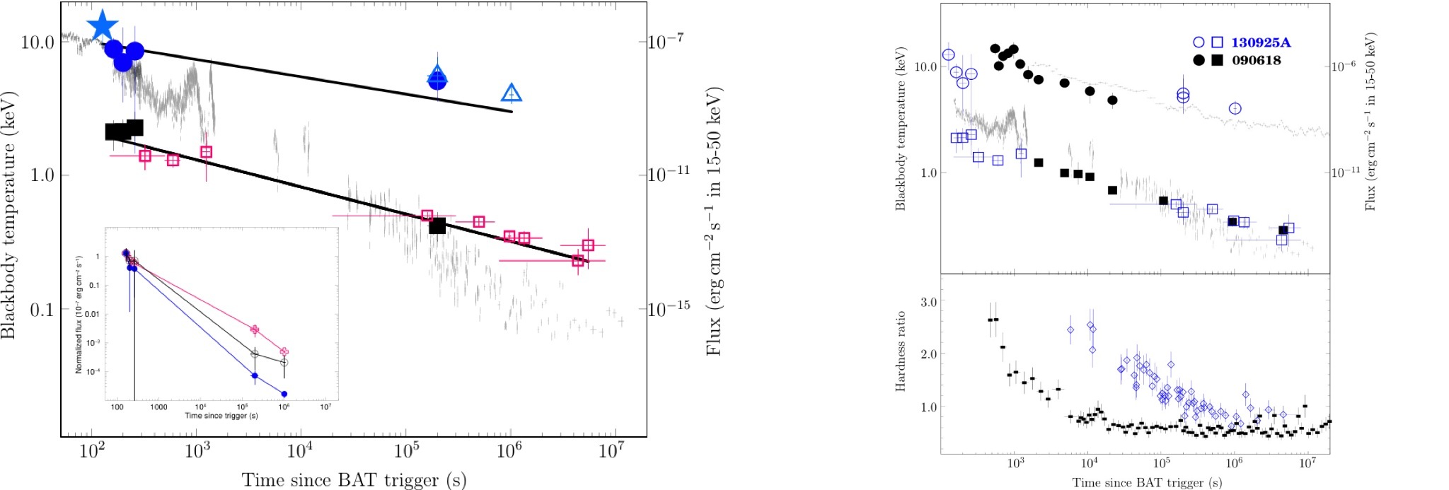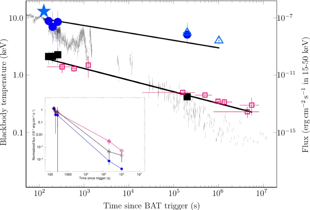 Na lewym panelu na rysunku otwarte kwadraty przedstawiają temperatury ciała doskonale czarnego wyznaczone przez Piro et al. i wykazuja one spadek o charakterze potęgowym w czasie (szare punkty to strumień GRB). Temperatury wyznaczone przez Belm et al. (otwarte trójkąty) wykazują odstępstwo od nich. Basak i Rao przeanalizowali dane powtórnie i wykazali, że dwie składowe termiczne współwystępują. Użyli w swojej analizie także danych Swift BAT. Jednoczesne dopasowanie modelu do danych BAT i XRT wykazało występowanie dwóch składowych termicznych (wypełnione symbole na rysunku). Na lewym panelu na rysunku otwarte kwadraty przedstawiają temperatury ciała doskonale czarnego wyznaczone przez Piro et al. i wykazuja one spadek o charakterze potęgowym w czasie (szare punkty to strumień GRB). Temperatury wyznaczone przez Belm et al. (otwarte trójkąty) wykazują odstępstwo od nich. Basak i Rao przeanalizowali dane powtórnie i wykazali, że dwie składowe termiczne współwystępują. Użyli w swojej analizie także danych Swift BAT. Jednoczesne dopasowanie modelu do danych BAT i XRT wykazało występowanie dwóch składowych termicznych (wypełnione symbole na rysunku). Z analizy wyłonił sie spójny model dwutemperaturowy, obiektu stygnącego w czasie.