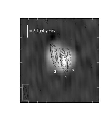 Mapa centralnych obszarów galaktyki NGC 660 wykonana za pomocą Europejskiej Sieci VLBI w październiku 2013 r. Oznaczenia: 1 – położenie czarnej dziury, 2 i 3 – dżety materii. Źródło: Megan Argo / JCBA. Przez kolejne trzy lata zespół naukowców, którym kierowała dr Megan Argo z Jodrell Bank Centre for Astrophysics, analizował wyniki obserwacji tej galaktyki z różnych teleskopów. Dane pochodziły z sieci radioteleskopów MERLIN w Wielkiej Brytanii, Westerbork w Holandii oraz Europejskiej Sieci VLBI (EVN) i instrumentów z Rosji, Chin i RPA. Dzięki tym obserwacjom można było spojrzeć na NGC 660 dokładniej niż w przypadku obrazów uzyskiwanych za pomocą pojedynczej anteny.
