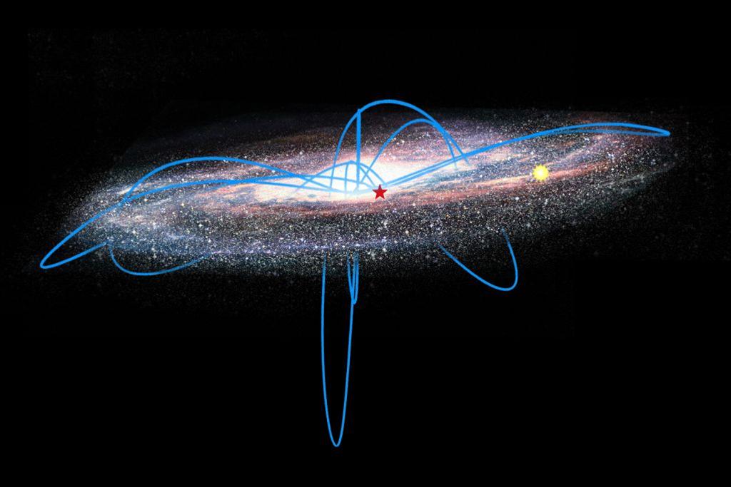 Wizualizacja możliwego przebiegu orbity szybkiej gwiazdy MACHO 176.18833.411 obserwowanej obecnie w zgrubieniu galaktycznym Drogi Mlecznej. Żółty punkt oznacza pozycję Słońca, a czerwony szybkiej gwiazdy. Źródło: AIP / J. Fohlmeister, A. Kunder.Jedna z gwiazd w centralnym zgrubieniu naszej Galaktyki porusza się nieoczekiwanie szybko w stosunku do innych jej sąsiadek, niewiele wolniej niż prędkość ucieczki z Drogi Mlecznej – wykazały badania, w których udział wzięli także Polacy.