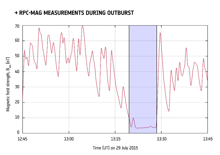 Najbardziej interesującą obserwacją był znaczący spadek oddziaływania elektromagnetycznego wiatru słonecznego w okolicy komety. Proces, w którym gaz i materiał gwałtownie wydostały się z wnętrza komety, był tak intensywny, że naładowane cząstki promieniowania słonecznego zostały odepchnięte od komety. W ten sposób wokół tego ciała niebieskiego powstał diamagnetyczny obszar.