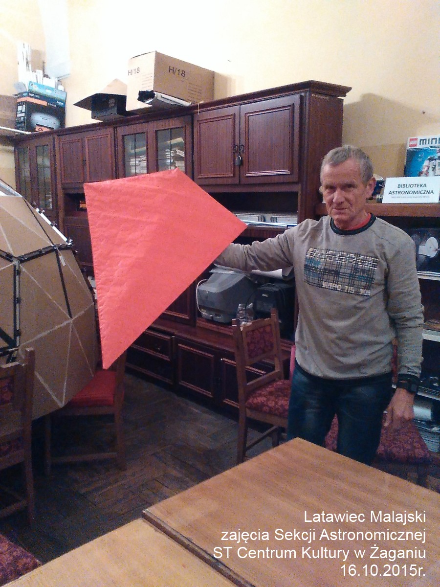 A skoro przy jesiennych klimatach jesteśmy, to jak każdej jesieni warto zorganizować niezapomniany Dzień Latawca. Aby zadość stało się tradycji poświęciliśmy nasz cenny czas na skonstruowanie jednego takiego Pana Latawca Malajskiego (na zdjęciu). Najciekawsze w tym wszystkim jest to, że jest to bardzo bliski krewny .... samolotu. Wykorzystuje dokładnie te same prawa fizyki i stał się prekursorem w realizacji odwiecznego marzenia człowieka o lataniu.