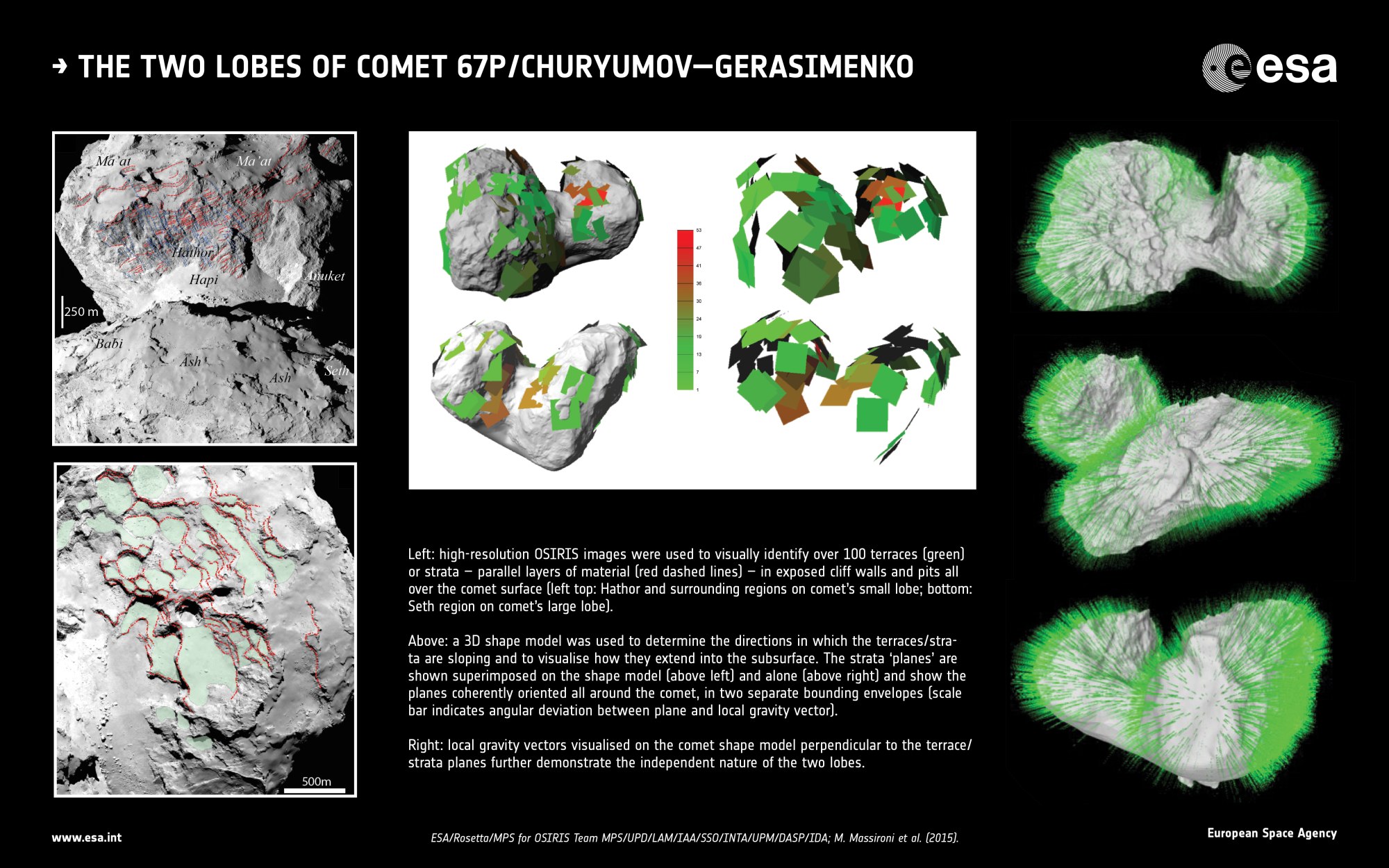 Warstwy na powierzchni komety „Ze zdjęć jasno wynika, że obie części komety mają swoją zewnętrzną powłokę podzieloną na wyraźne warstwy. Sądzimy, że sięgają one kilkaset metrów w głąb”, wyjaśnił Matteo Massironi z Uniwersytetu w Padwie, naukowiec zespołu kamery OSIRIS sondy Rosetta i główny autor pracy naukowej na ten temat.