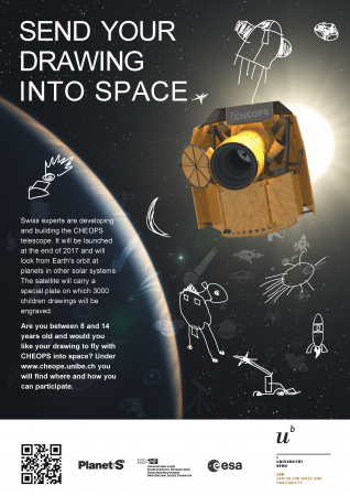 Poster - CheopsDzięki Europejskiej Agencji Kosmicznej (ESA) dzieci w wieku od 8 do 14 lat mogą wysłać w kosmos swoje rysunki. Zgłoszenia przyjmowane są do końca października. Pomniejszone wersje rysunków będą umieszczone na satelicie Cheops.