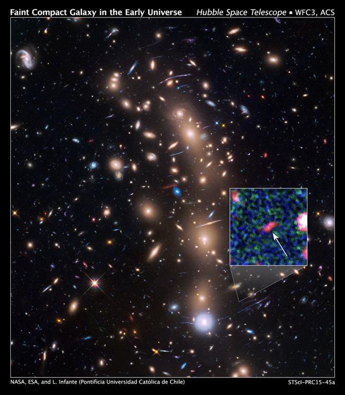 Słaba galaktyka z krańców Wszechświata (w ramce, wskazana strzałką) widoczna w stanie, gdy Wszechświat miał zaledwie 400 mln lat.. Źródło: NASA, ESA i L. Infante (Pontificia Universidad Católica de Chile)Za pomocą dwóch teleskopów kosmicznych astronomom udało się zbadać słabą galaktykę z krańców Wszechświata, istniejącą w okresie zaledwie 400 milionów lat po Wielkim Wybuchu - informuje NASA.