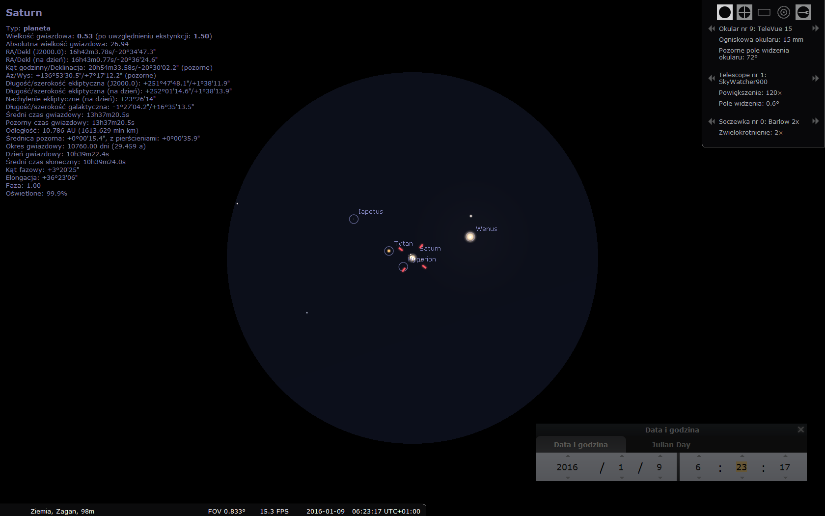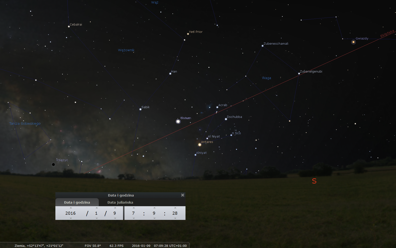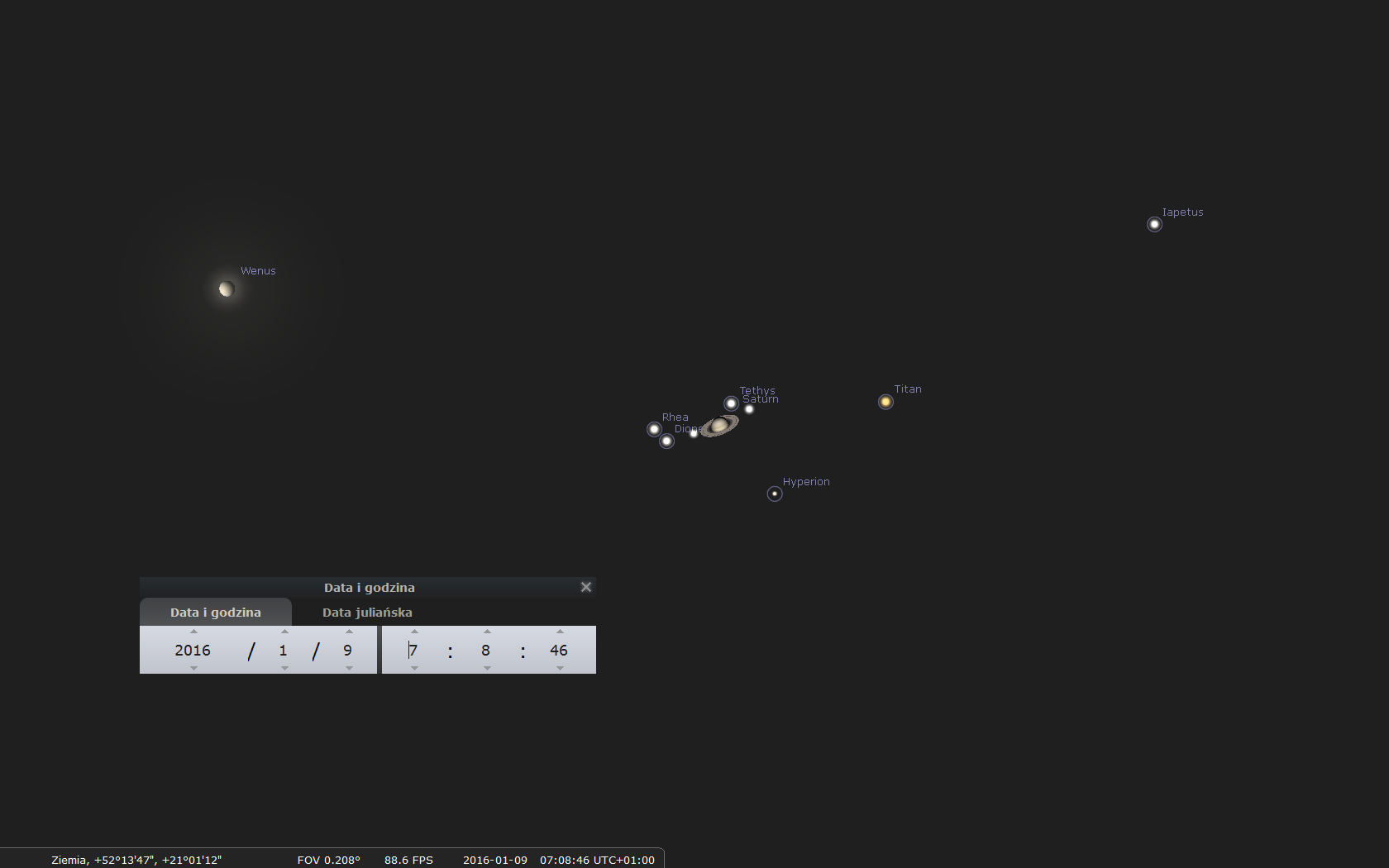 Widok spotkania c=iał niebieskich 9 stycznia 2016r. rano w zbliżeniu. Obrazy wygenerowane w Stellarium