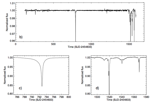 Zmiany jasności KIC 8462852 zarejestrowane przez Keplera. Oś odciętych w skali dób; średnia jasność gwiazdy, przyjęta jako 1, na osi rzędnych / Credit: NASAMedia na całym świecie podchwyciły temat. Spośród kilku możliwych wyjaśnień, takich jak duża i nieregularna chmura pyłu lub wielka ilość komet, informowano głównie o możliwości zaobserwowania potężnej struktury, zbudowanej przez zaawansowaną technologicznie cywilizację.