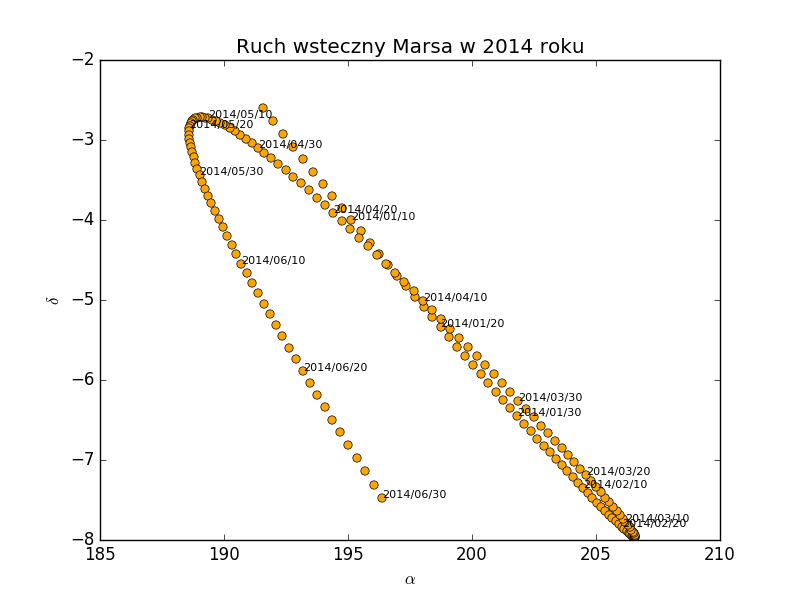 Pętla Marsa obliczona w programie napisanym w Python'ie z wykorzystaniem biblioteki PyEphemNiejako przy okazji kontynuujemy edukację w zakresie programowania w języku Python. Oto nasz tajemniczy wąż. Język ten jest bardzo ceniony przez naukowców w tym astronomów. dla tego języka dostępnych jest bardzo dużo modułów, które niezwykle ułatwiają tworzenia aplikacji na nasze potrzeby a jednocześnie robią je bardzo atrakcyjne. Na naszej tapecie znalazł się moduł PyEpchem stworzony i rozwijany na podstawie aplikacji z Clear Sky Institute. Z tej stajni znamy Xepchem dla platformy UNIXowej.