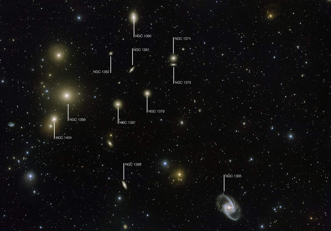 W centrum tej gromady, w środku trzech jasnych, rozmytych plam po lewej stronie zdjęcia, znajduje się obiekt znany jako galaktyka cD — galaktyczna kanibalka. Galaktyki cD, takie jak ta, nosząca nazwę NGC 1399, wyglądają podobnie do galaktyk eliptycznych, ale są większe i mają bardziej rozległe, słabe otoczki [1]. Dzieje się tak dlatego, że rosną poprzez pochłanianie mniejszych galaktyk przyciąganych grawitacyjnie w stronę centrum gromady [2].
