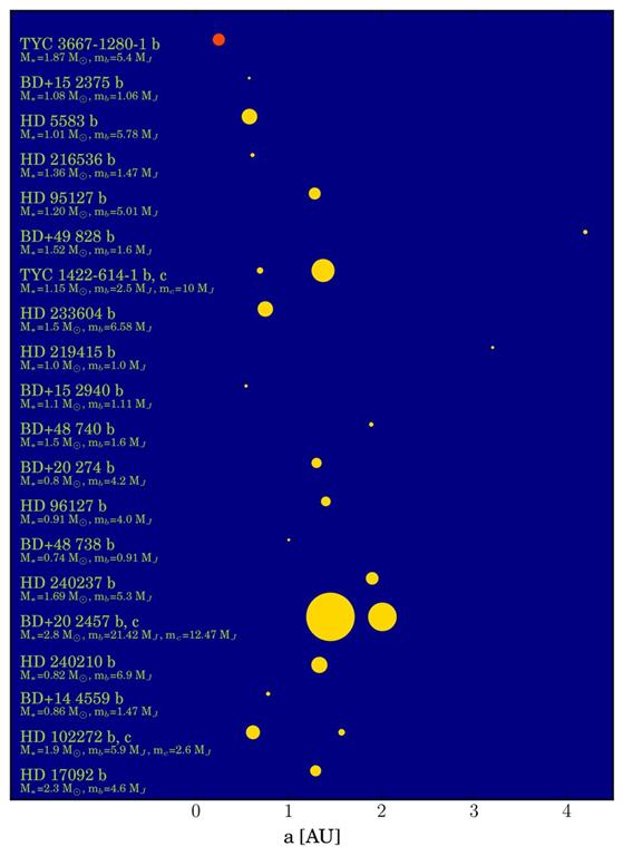Zestawienie dwudziestu planet pozasłonecznych odkrytych przez zespół prof. Andrzeja Niedzielskiego z Centrum Astronomii UMK. Na osi poziomej pokazano odległość planet od swoich gwiazd (w jednostkach astronomicznych, bez zachowania skali). Z kolei wielkość symboli wskazuje na masy planet. Źródło: UMK. Międzynarodowa grupa badawcza, którą kieruje prof. Andrzej Niedzielski z Centrum Astronomii UMK, ogłosiła we wtorek odkrycie swojej dwudziestej planety. Toruńscy astronomowie specjalizują się w badaniach planet okrążających czerwone olbrzymy, czyli gwiazdy w późnej fazie ewolucji, którą Słońce osiągnie za kilka miliardów lat.