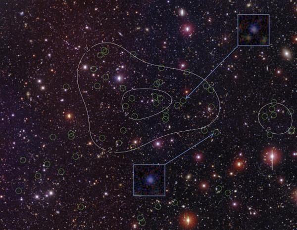 Nowo odkryta protogromada galaktyk w gwiazdozbiorze Woźnicy, w polu NOAO Deep Wide-field Survey. Zielonymi okręgami oznaczono galaktyki, dla których potwierdzono członkostwo w gromadzie. Kontury gęstości (białe linie) wskazują na koncentrację galakty Astronomowie wykonali obserwacje, dzięki którym odkryli gromadę galaktyk z wczesnego etapu ewolucji Wszechświata. Ta „protogromada” odległa jest od nas o 12 miliardów lat świetlnych i widzimy ją w stadium, w jakim Wszechświat miał około 12 proc. obecnego wieku – informuje amerykańskie National Optical Astronomy Observatory (NOAO).