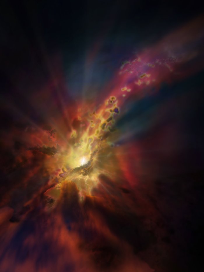 Do tej pory astronomowie sądzili, że w największych galaktykach supermasywne czarne dziury zasilane są powolną i stałą dietą złożoną z gorącego, zjonizowanego gazu z halo galaktycznego, Nowe obserwacje ALMA pokazują, że gdy warunki międzygalaktycznej pogody są odpowiednie, czarne dziury mogą „połykać” także chaotyczną „ulewę” z olbrzymich obłoków zimnego gazu molekularnego.