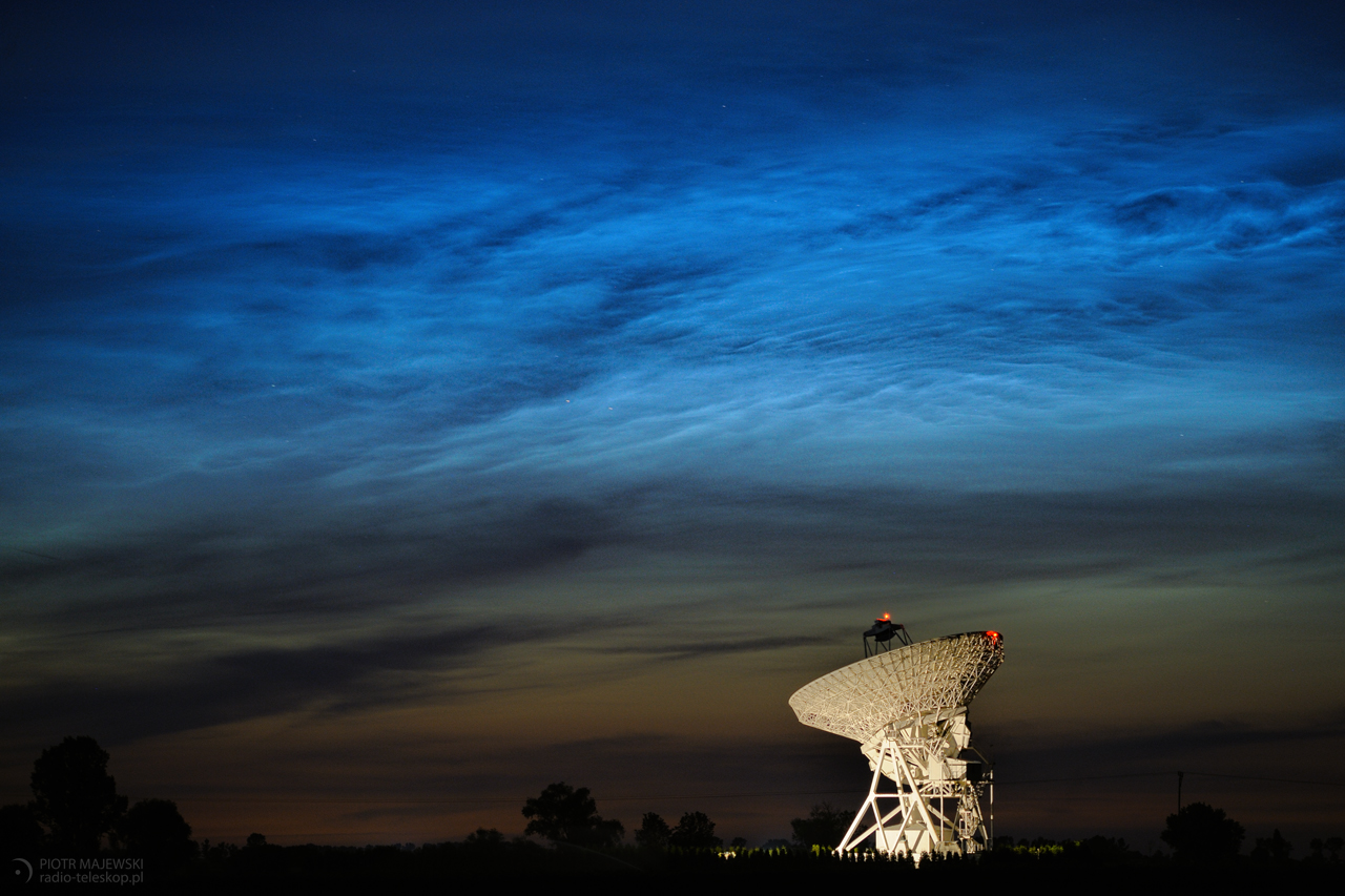 Obłoki srebrzyste w towarzystwie radioteleskopu w Piwnicach. Autor: Piotr MajewskiDo 1 lipca można w Toruniu oglądać wystawę astrofotografii zatytułowaną „Radio-teleskop.pl”. Dostępna jest w Dworze Artusa na Starym Mieście. "Radio-teleskop.pl" to tytuł wystawy zdjęć autorstwa Piotra Majewskiego, który od dekady zajmuje się fotografowaniem obiektów na niebie. Wystawa jest prezentacją najciekawszych prac z tego okresu. Pokazywane prace to nie tylko zdjęcia samych ciał niebieskich, ale fotografie astrokrajobrazowe - krajobrazów, dla których obiekt astronomiczny jest elementem komponującym się razem z budynkami lub ziemską przyrodą w ciekawe ujęcie.