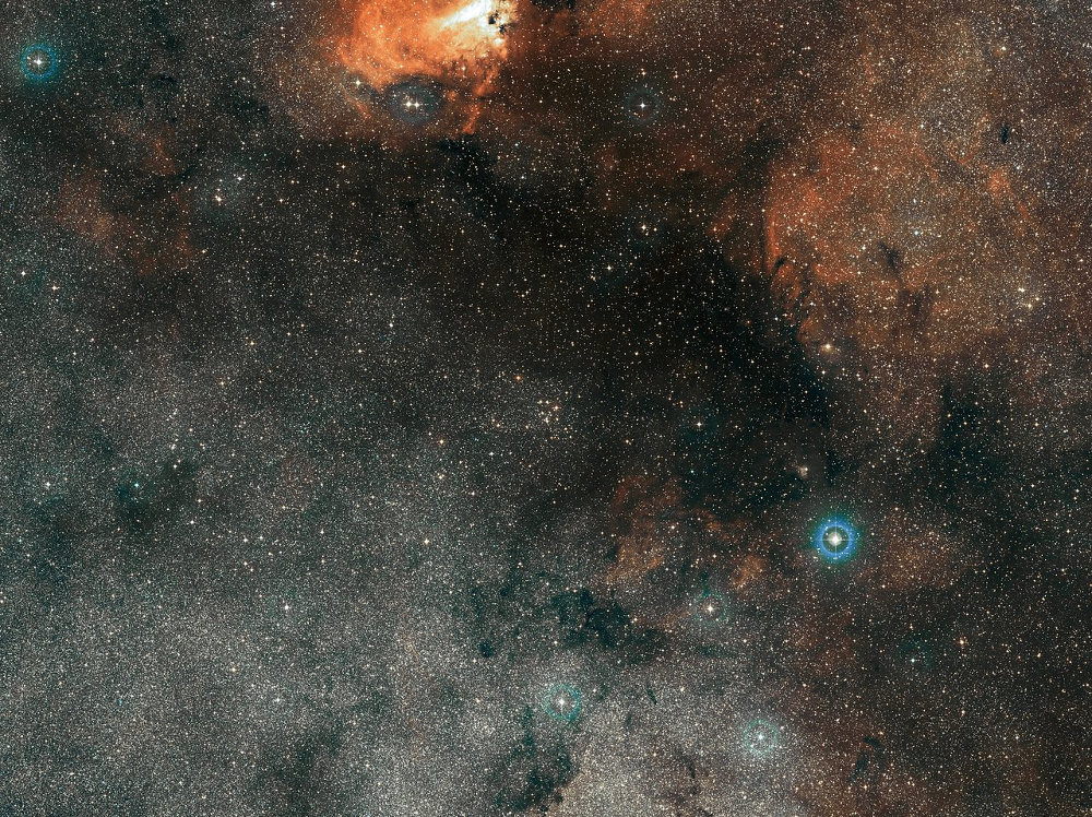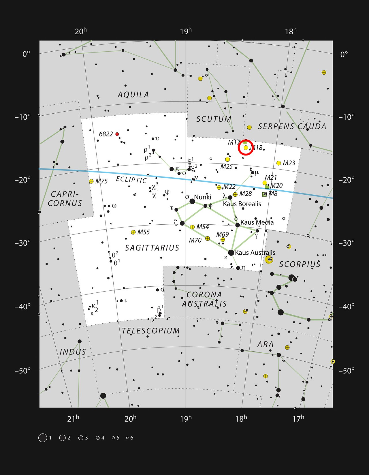 Niewielka grupa jasnych, niebieskich gwiazd w lewym górnym rogu tego olbrzymiego 615-megapikselowego zdjęcia, to idealne kosmiczne laboratorium do badania życia i śmierci gwiazd. Gromada gwiazd, znana pod nazwą Messier 18, zwiera gwiazdy, które powstały razem z tego samego masywnego obłoku gazu i pyłu. Zdjęcie pokazuje także czerwone obłoki świecącego wodoru i ciemne pasma pyłu. Zostało wykonane za pomocą VLT Survey Telescope (VST), pracującego w należącym do ESO Obserwatorium Paranal w Chile.