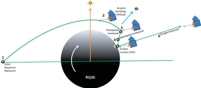 Aby dotrzeć do Bennu sonda wykorzysta zjawisko katapulty grawitacyjnej. Za rok i dwa tygodnie, 22 września 2017 roku, minie Ziemię, aby nabrać prędkości i skierować się w stronę asteroidy. Dotrzeć do niej powinna w sierpniu 2018 roku.