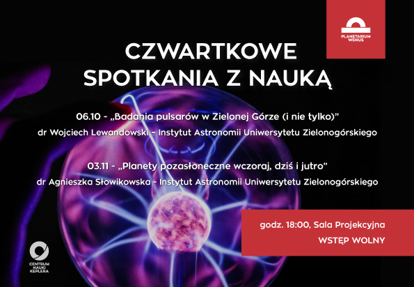 Centrum Nauki Keplera serdecznie zaprasza na nowy cykl spotkań naukowych do Planetarium Wenus. Centrum Nauki Keplera serdecznie zaprasza na nowy cykl spotkań naukowych do Planetarium Wenus. Zaczynając od października, w każdy pierwszy czwartek miesiąca, w Sali Projekcyjnej odbędą się wykłady popularnonaukowe wygłaszane przez naukowców Uniwersytetu Zielonogórskiego.
