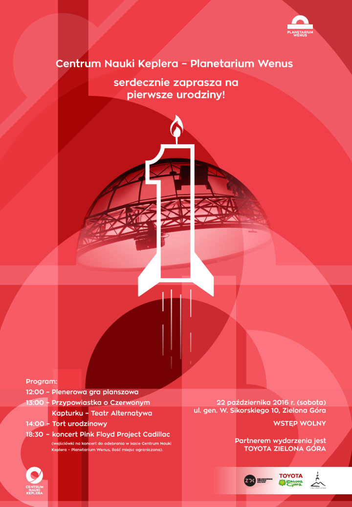22 października 2016 roku Planetarium Wenus obchodzi będzie swoje pierwsze urodzinyW sobotę 22 października Planetarium Wenus będzie świętowało 1 rok działalności! Zapraszamy serdecznie na nasze pierwsze urodziny, mamy nadzieję, że będziecie z nami! Przygotowaliśmy dla Was kilka atrakcji: dzieci z rodzicami zapraszamy na „Przypowiastkę o Czerwonym Kapturku” i plenerową grę planszową (jeśli pogoda nie dopisze, to przeniesiemy się do środka, ale liczymy na piękne słońce). Po zabawie przyjdzie pora na kosmiczny tort urodzinowy, a wieczorem… Coś dla nieco starszych! – koncert Pink Floyd – Zespołu Cadillac.