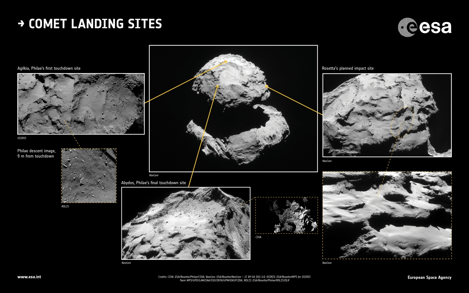Różne ujęcia miejsca lądowania. Copyright CIVA: ESA/Rosetta/Philae/CIVA; NAVCAM: ESA/Rosetta/NAVCAM – CC BY-SA IGO 3.0; OSIRIS: ESA/Rosetta/MPS for OSIRIS Team MPS/UPD/LAM/IAA/SSO/INTA/UPM/DASP/IDA; ROLIS: ESA/Rosetta/Philae/ROLIS/DLR„Pracowaliśmy w wyjątkowo trudnych warunkach komety przez 786 dni, wykonaliśmy szereg śmiałych przelotów blisko jej powierzchni, przetrwaliśmy szereg niespodziewanych wyziewów z jej wnętrza i poradziliśmy sobie z dwoma wejściami sondy w tryb awaryjny,” mówi dyrektor ds. operacji Sylvain Lodiot.
