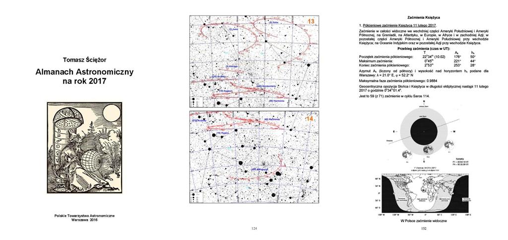 Almanach Astronomiczny na rok 2017 ? okładka i przykładowe strony. Rys. Tomasz Ściężor / PTA. Polskie Towarzystwo Astronomiczne (PTA) wydało bezpłatną publikację zawierającą dane na temat różnorodnych zjawisk astronomicznych w 2017 roku. Almanach jest dostępny w wersji elektronicznej w portalu Uranii, a także na urządzenia mobilne.