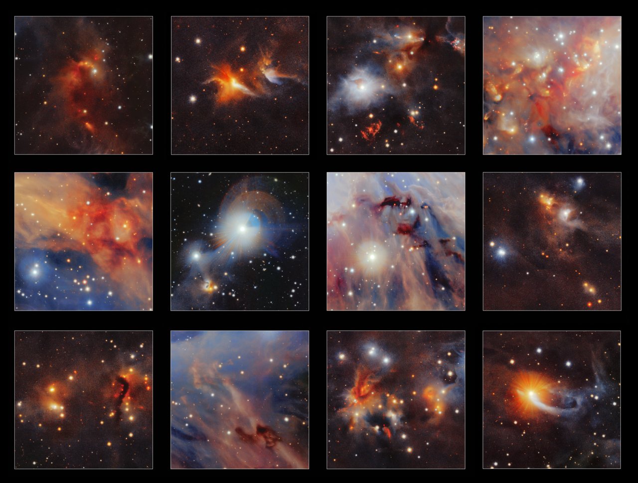 W innym miejscu na zdjęciu możemy spojrzeć w ciemne obłoki molekularne kompleksu Orion A i dostrzec wiele ukrytych "skarbów", w tym dyski materii, z których mogą narodzić się nowe gwiazdy (dyski przedgwiazdowe), mgławice związane z nowo narodzonymi gwiazdami (obiekty Herbiga-Haro), mniejsze gromady gwiazd, a nawet gromady galaktyk leżące daleko poza Drogą Mleczną. Przegląd VISION pozwala na systematyczne badania najwcześniejszych faz ewolucyjnych młodych gwiazd wewnątrz pobliskich obłoków molekularnych.