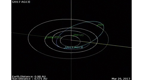 Moment największego zbliżenia 2017 AG13 do Ziemi nastąpi 9 stycznia o godzinie 13:49 CET. Źródło NASADziewiątego stycznia dojdzie do bliskiego przelotu planetoidy 2017 AG13 obok Ziemi. To pierwszy wykryty bliski przelot w nowym roku.