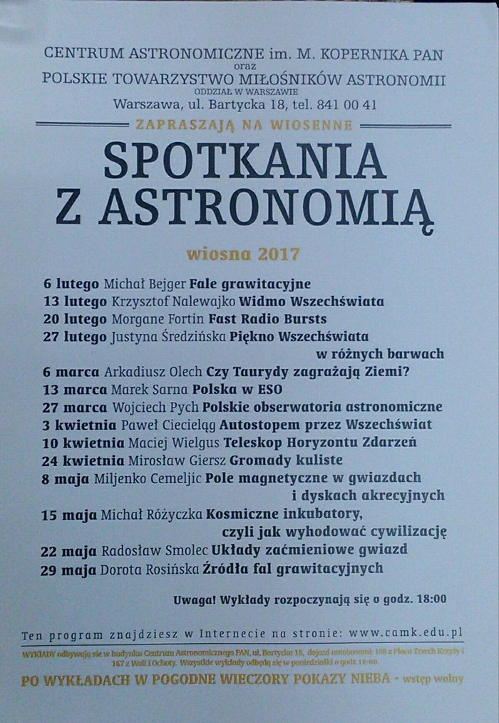 Centrum Astronomiczne im. Mikolaja Kopernika z siedzibą w Warszawie już teraz zaprasza na "Wiosenne Spotkania z astronomią - cykl wykładów popularnonaukowych z astronomii. Przy sprzyjającej pogodzie możliwe także obserwacje teleskopem optycznym!